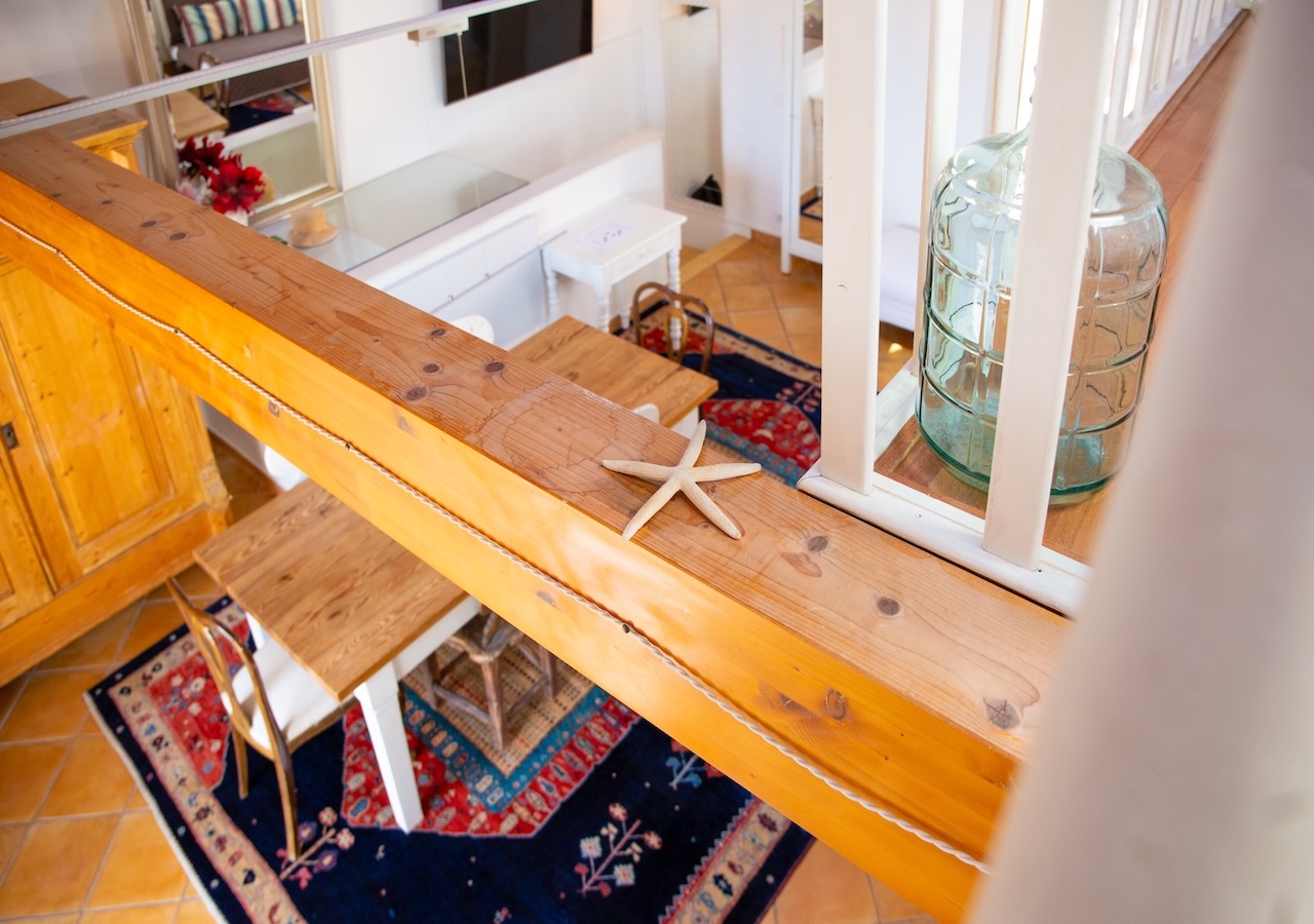 Im ersten Stock befindet sich der große, helle Wohnbereich mit Balkon, eine voll ausgestattete Küche und ein Badezimmer mit Fenster und großer Dusche. Im liebevoll dekorierten Wohnraum gibt es ein 160 cm breites Doppel-Schlafsofa und einen Essbereich. Vom Balkon aus kann man einen Blick auf den nahen und berühmten Hafen von Porticello erhaschen. Der Schlafbereich, erreichbar über eine schöne Holztreppe und die Galerie, bietet neben einem Arbeitsplatz auch 2 Doppelbetten mit je 140 cm breiter Liegefläche.